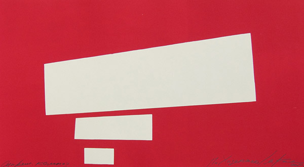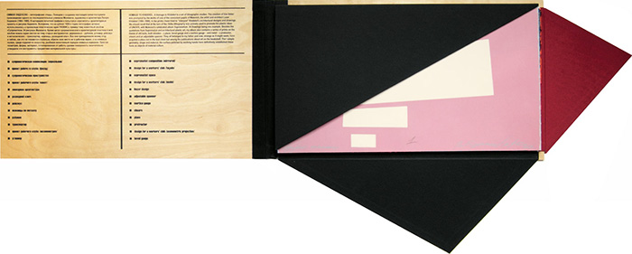 12+1 compositions – lithograph in one colour printed by the artist on BFK Rives Cream paper. Unbound. In a folder — plywood, cardboard covered with book cloth, silkscreen printed. In Russian and in English; translated by Paul Williams.
