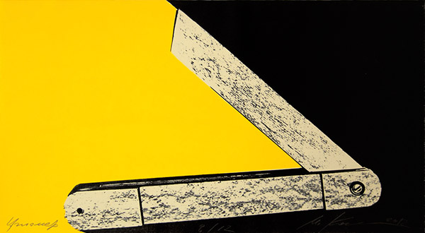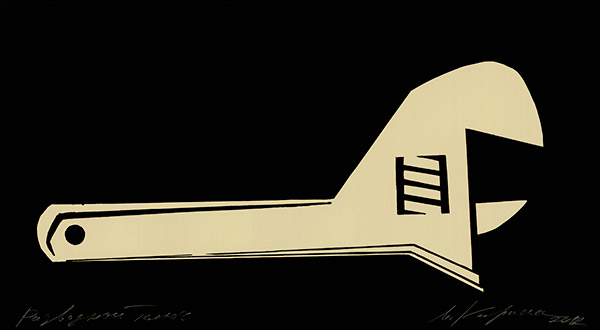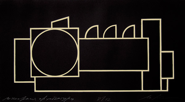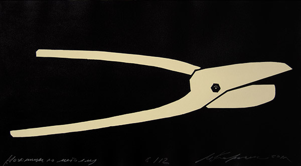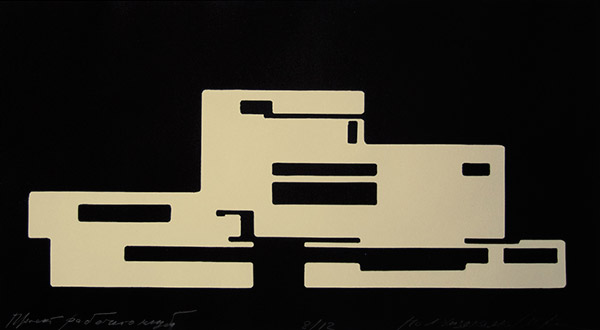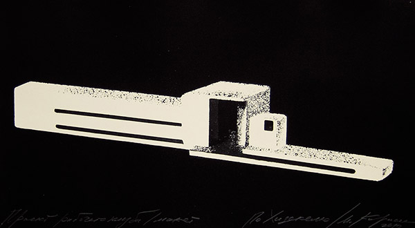 A Homage to Khidekel is a set of lithographic studies. The creation of this folder was prompted by the works of one of the consistent pupils of Malevich, the artist and architect Lazar Khidekel (1904–1986). In the prints I have tried to ‘interpret’ Khidekel’s architectural designs and drawings. We should recall that at the turn of the 1920s lithography was actively used to promote the plastic ideas of UNOVIS, with Malevich’s celebrated album 34 Drawings being one example. Besides the quotations from Suprematist and architectural plastic art, my album also contains a series of prints on the theme of old tools, both wooden — a plane, bevel gauge and a mortice gauge — and metal — a protractor, shears and an adjustable spanner. They all belonged to my father and now, strange as it might seem, have acquired a place not in the tool chest but among the publications about art on the bookshelf. Their simple geometry, shape and material, the surface polished by working hands have definitively established these tools as objects of material culture.