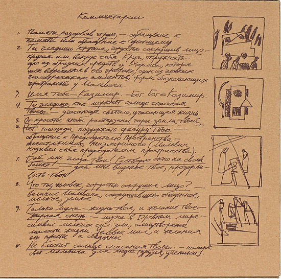 2) 18 экземпляров — 14 страниц, литография в одну краску на бумаге; обложка — цветная литография на грунтованном холсте, использован рисунок Малевича (эскиз ткани). Иллюстрации и текст выполнены литографским карандашом, стальным и тростниковым пером. Футляр (355 × 370) — картон, бумага, цветная литография, использован рисунок Малевича (эскиз ткани). Предохранительный футляр — литография в одну краску на картоне: комментарии к стихотворению (М. Карасик) на русском языке. Приложение: перевод текста стихотворения и комментариев на английский и немецкий языки. -