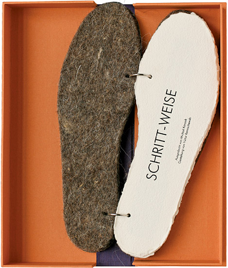 Санкт-Петербург: M.K. Publishers, 2001. 308 × 100. Совместное издание Михаила Карасика и Виктора Ремишевского. На немецком языке. 20 страниц в обложке и футляре. Тираж 10 нумерованных экземпляров. Обложки: войлочные стельки 46 размера; блок — бумага ручного литья, шелкография. Футляр: картон, цветная бумага, высокая печать.