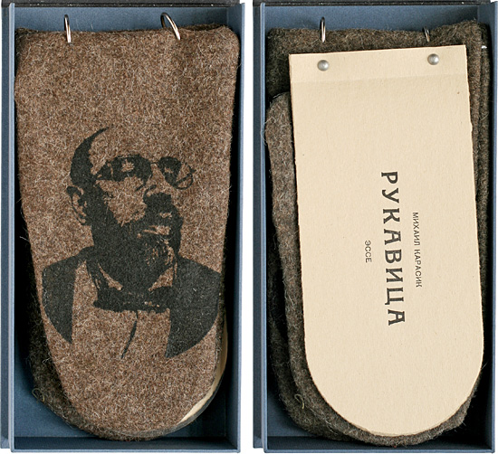 Дизайн: Виктор Ремишевский. Санкт-Петербург: M.K. Publishers, 2001. 260 × 150. 24 страницы в обложке и футляре. На русском языке. Тираж: 30 нумерованных и подписанных художниками экземпляров. Сброшюрована. Текст — высокая печать, ручной набор; форзацы — плексиглас. В качестве обложки использованы две оригинальные рабочие рукавицы — войлок, высокая печать, ручной набор. Футляр (157 × 295 × 56) — картон, цветная бумага, высокая печать, ручной набор. Приложение: перевод текста на английский и немецкий языки.