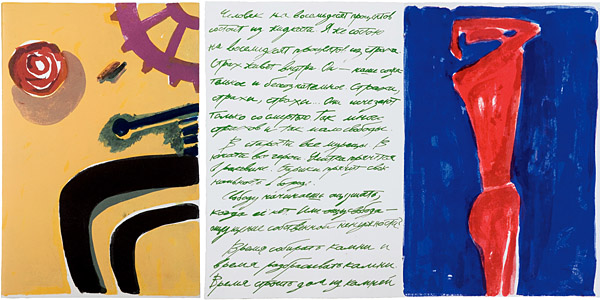 Санкт-Петербург: Издательство М.К. при участии Сержа Плантюро (Париж), 2004. 425 × 330. 34 страницы в обложке и футляре. На русском языке. Тираж: 25 нумерованных экземпляров. Сброшюрована. Текст — грунтованный холст, высокая печать, ручной набор. Иллюстрации — 15 композиций: грунтованный холст, цветная литография акрил. Обложка — бумага, картон, литография. Футляр — картон, коллаж, эмалевая плакетка. Приложение: перевод текста на английский и французский языки.