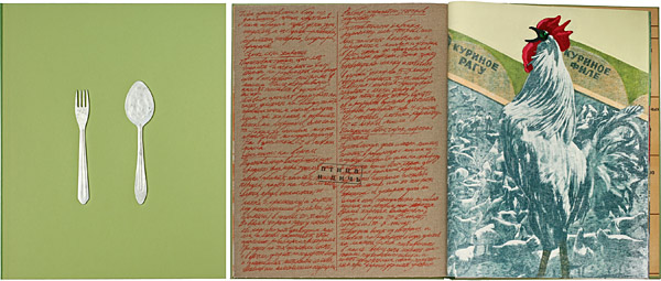 1970-х годов. Футляр (465 × 380) — бумага, картон, коллаж (алюминиевые ложка и вилка). Приложение: перевод текста на английский и немецкий языки. -