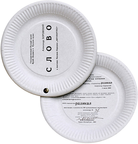 Санкт-Петербург: M.K. Publishers, 2003. 203 × 203. тираж 200 нумерованных экземпляров. На русском языке. Ручной набор, высокая печать. Напечатано на 8 картонных тарелках. Футляр: картон, шелкография в 2 краски.
