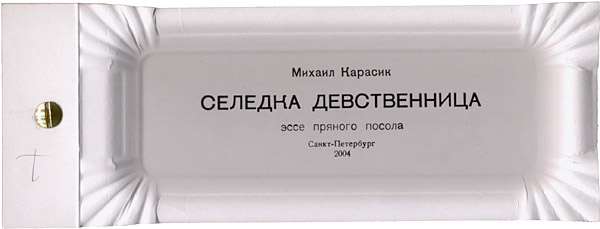 Санкт-Петербург: Издательство М.К., 2004. 9,0 × 22,3. 7 листов в футляре. Тираж 30 нумерованных и подписанных экземпляров. Сброшюрована. Текст — картон (бумажные тарелки), ручной набор, высокая печать. Футляр — черный картон, приклейка (этикетка «Сельдь специального посола. Атлантическая. Крупная. Жирная»): офсет.