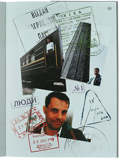 Санкт-Петербург: Издательство M.K., 2001. 360 × 250. 24 страницы в обложке и футляре. На русском и английском языках. Тираж: 30 нумерованных и подписанных экземпляров. Сброшюрована. Текст — шелкография, тушь, перо, резиновые штампы; коллаж — 13 фотографий. Обложка — картон, ледерин, цинкография, золотая фольга. Футляр (368 × 260) в форме почтового конверта — цветной картон, высокая печать, ручной набор.